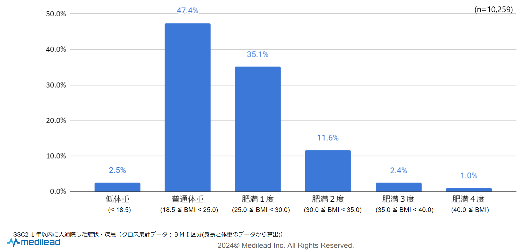 〈図5〉この1年で高血圧症で入通院した方のBMI分類を見ると、肥満1度と肥満2度で46.7%を占めていた。一方で、約5割の高血圧症の方が普通体重であることから、体重を減らす以外の血圧管理の重要性もうかがえる