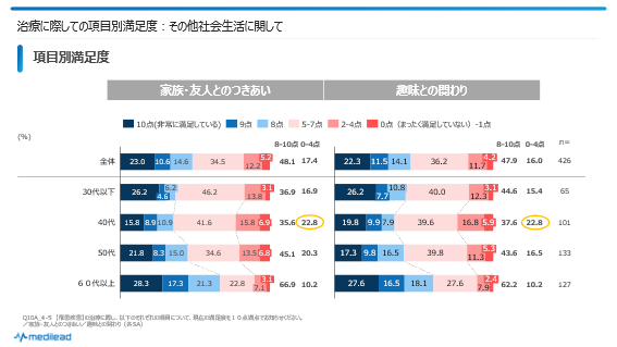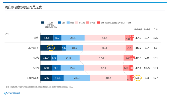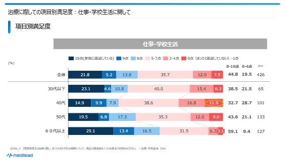 今回は特に、治療においても状態においても40代での満足度が低いということがわかりました。40代は仕事や家庭での役割が他年代に比べ大きく、出費もかさみがちです。そのため、治療費用がネックになるとともに、仕事との両立についての悩みも深く、この面についてケアが少ないと不満につながりやすいと考えられます。