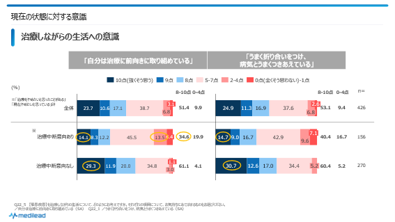 現在の状態に対して「【罹患疾患】を治療しながらの生活について、どのようにお考えですか。それぞれの項目について、お気持ちにあてはまるものをお選びください。」と質問しました。