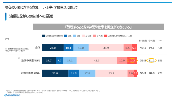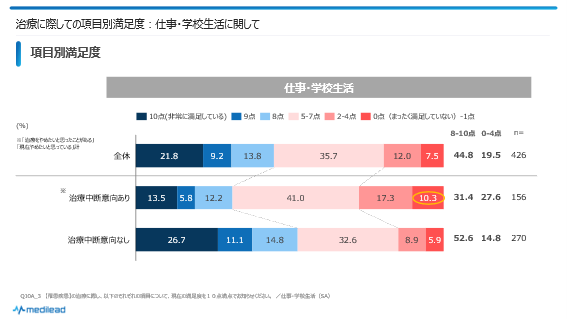 - 仕事・学校生活に「満足」と感じられていない→治療継続のモチベーションを下げ、間接的に中断意向に影響している