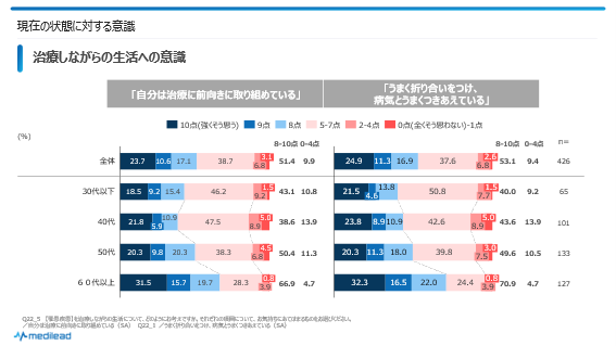 「自分は治療に前向きに取り組めている」「うまく折り合いをつけ、病気とうまく付き合えている」の両方とも、40代で4点以下の割合がやや高くなっています。治療の満足度については40代で低めの傾向がありましたが、治療の結果の「状態」においても、40代では不満気味の人がやや多いことがうかがえます。ただし、0-1点の割合がさほど高いわけではないので、他年代と比べてはっきりとネガティブなわけではなく、なんとなくネガティブ寄りといった感じかもしれません。