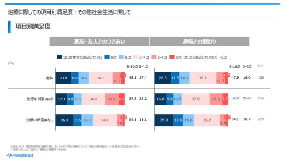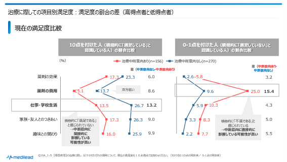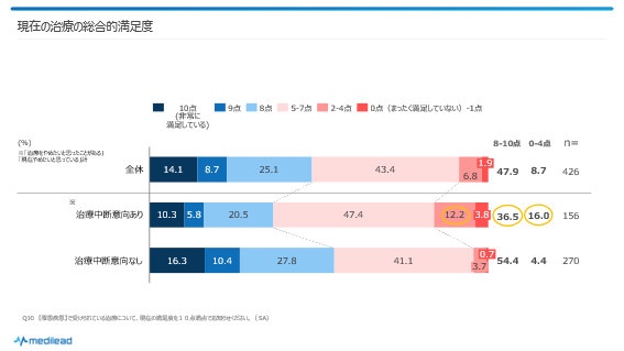 10段階で回答してもらっていますが、例えば満足度において0-1点の低得点をつけている人は、はっきりと「不満」を認識していると考えてよいでしょう。そして、治療中断意向あり者において特に0-1点を付けた人の多い項目は中断意向に直接的につながっていると考えられます。
