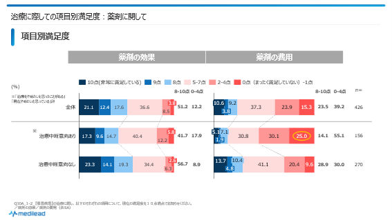 どちらも中断意向あり者の方がなし者より満足度は低めです。特に「薬剤の費用」に関しては、中断意向あり者で0-1点と答えた人が25%にのぼっています。つまり中断意向あり者は、薬剤の費用に対し、「何となく不満」「何となく満足ではない」といった曖昧なものではなく、かなり強めに「不満」を抱いていることがうかがえます。
