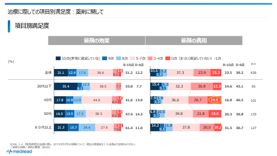 注目すべきは、治療中断意向にも影響が大きかった「薬剤の費用」についてです。最も満足度が低いのは40代でした(8点以上が低く、4点以下が高い)。0-1点の割合も19.8%と他年代より高くなっています。4点以下の割合でみると46.5%にのぼっており、40代で特に費用に関する不満が高いことがわかります。40代は子どもの教育費などプライベート面の出費がかさみがちな年代です。ただでさえ出費が多いのに自身の薬にまで費用をかけたくない、かける余裕がない…という苦しい状況がうかがえます。