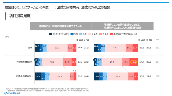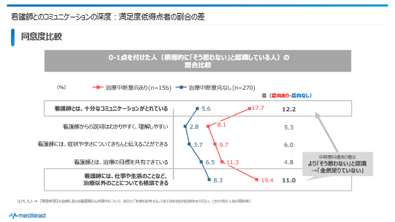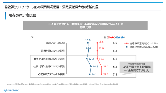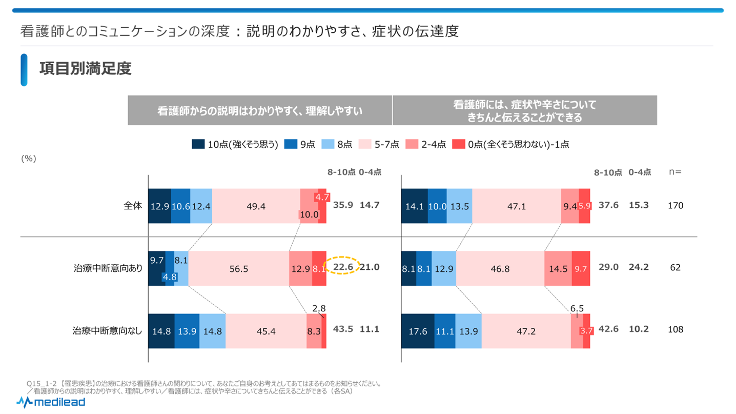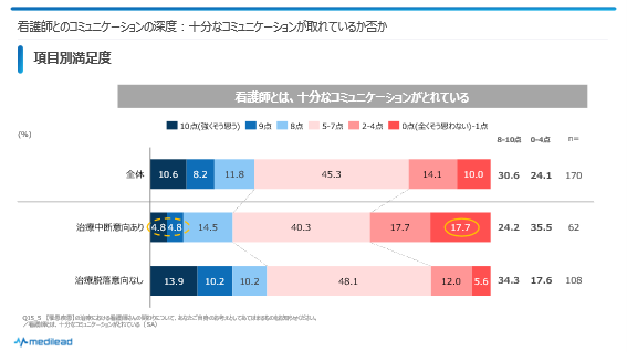 看護師とのコミュニケーションもそもそも十分でなく、全体として「満足していない」とはっきり認識されているという結果になりました。十分なコミュニケーションができていないことは、中断意向にも影響していました。