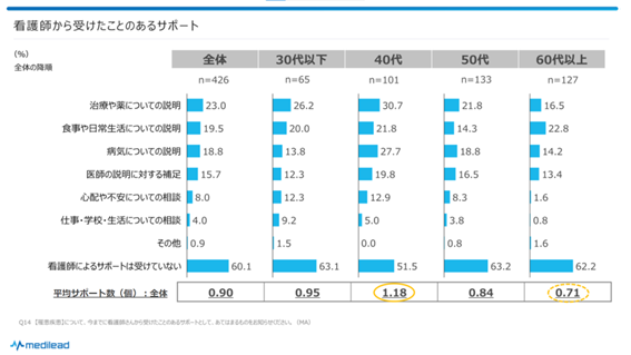 看護師からのサポートを受けていると回答した割合がわずかに高いのは40代です。「サポートを受けていない」という40代は51.5%で全体より5%ほど低く、平均回答個数(選んだ選択肢の数)も1.18個と最も高くなっています。