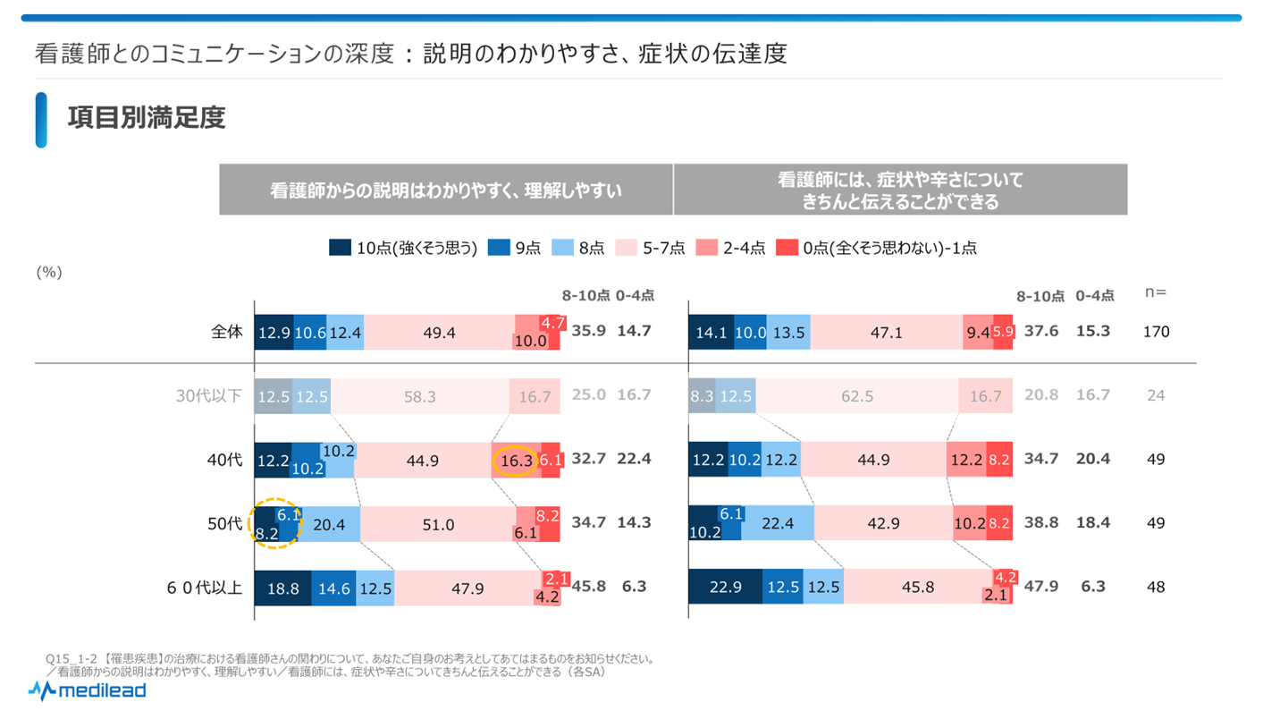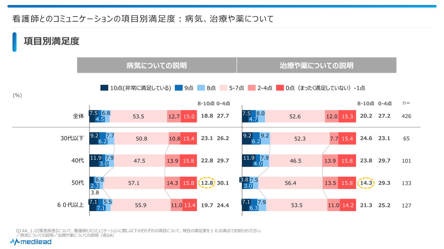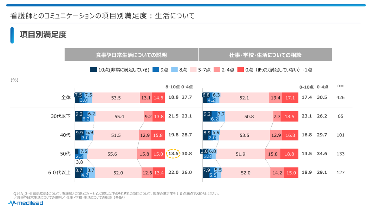 全体として、50代での満足度が低いことが目立ちます。病気、治療や薬、食事や日常生活についての説明については50代では8-10点の高得点の割合が低く、「満足度が高くない」状態です。一方で、「仕事・学校、生活についての相談」や「心配や不安についての相談」といった治療外の相談事については4点以下の低得点の割合が高く、「不満が高い」状態です。こちらも治療外の相談ごとについては看護師とコミュニケーションそのものを行っていないため、低得点の割合が高くなっていると考えられますが、50代では特にその不満が強く認識されているとも考えられます。