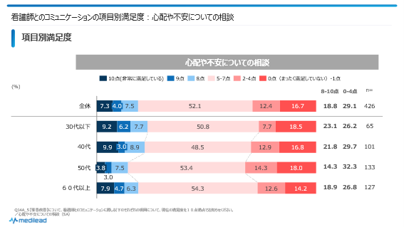 一方で40代は、仕事や生活など治療以外の悩みが多い年代であるにもかかわらず、50代より「満足度の低さ」「不満の強さ」の度合いは低めでした。40代は悩みがあってもそもそも看護師を頼ろうとせず、ソーシャルワーカーや臨床心理士などへの相談意向が他年代より高いことから、看護師に対する期待も不満も少ないのかもしれません。