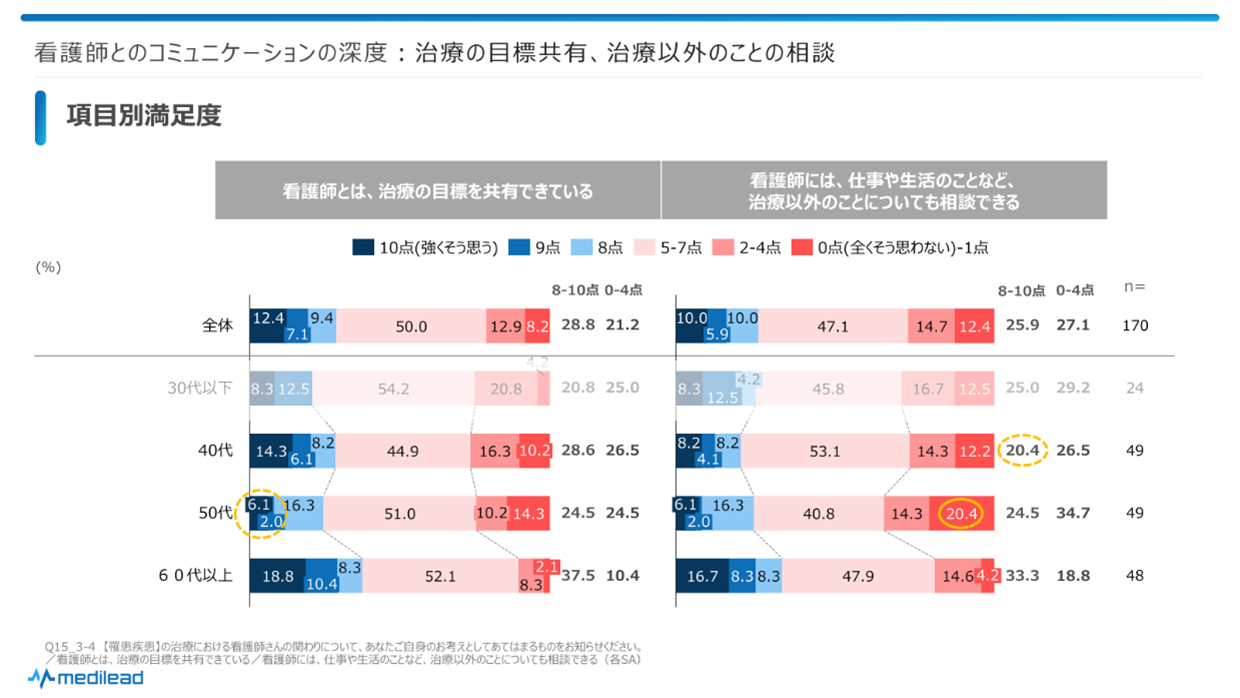 50代では特に「治療以外のことも相談できる」において不満が感じており、看護師にもっと役割を果たしてほしいと感じていることがうかがえます。裏を返せば看護師に対する期待が高いのかもしれません。