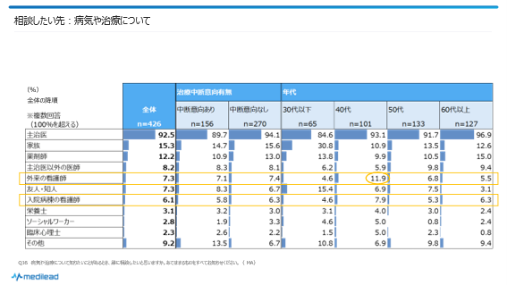 では医師以外のコメディカルとのコミュニケーションはどうなのでしょうか。今回は、主に看護師との関わり方や看護師の果たしている役割にフォーカスし、中断意向の有無に加え年代別での違いを見ていきます。