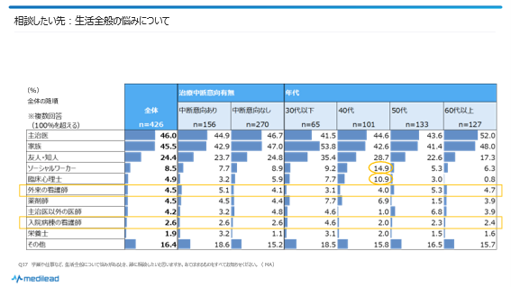 40代は前回まで見てきたように、治療と仕事の両立などの悩みを抱えがちな年代です。しかしその際に悩みをどこに相談したいのかというと、ソーシャルワーカーや臨床心理士などの看護師以外の専門家であり、つまり看護師を相談先とは思っていないということがわかります。
