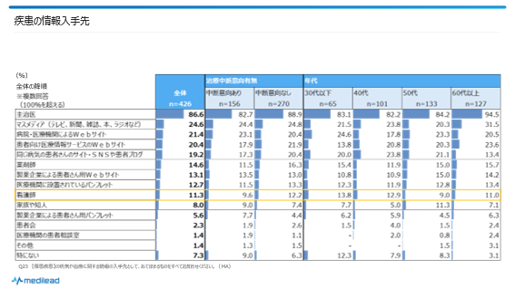 こちらも主治医が圧倒的です。二位以降は全体でも25%に満たず、疾患についての情報を得るのは主治医からのみという人が多いことがわかります。