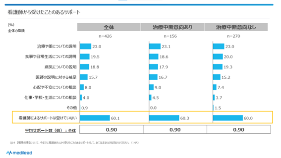 しかしながら調査結果では、そもそも「看護師のサポートは受けていない」という人が6割に上りました。また、サポートを受けている人も主に治療に関する内容が中心で、仕事や生活など治療外の相談のサポート率は1割未満という結果でした。