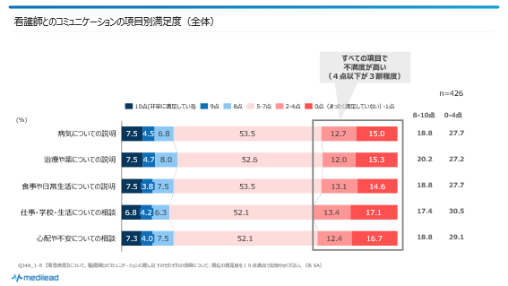 看護師とのコミュニケーションについて、内容別に満足度を調査しました。