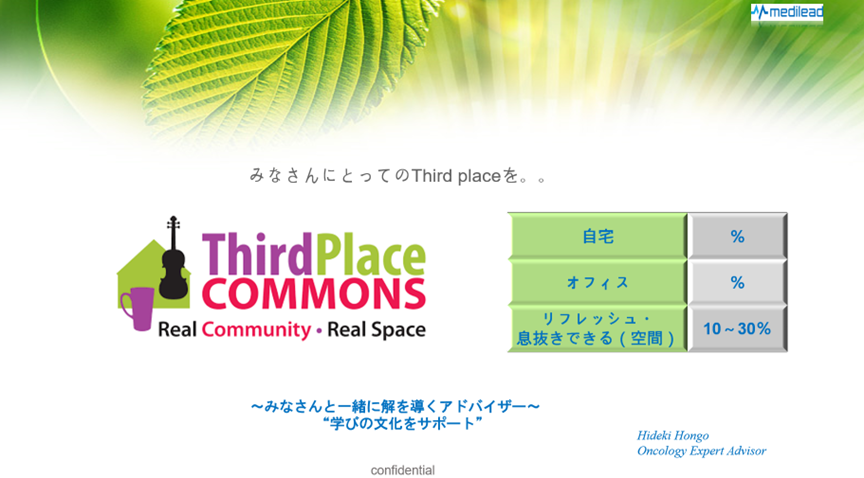 株式会社メディリードは、当社のオンコロジーエキスパートアドバイザーである北郷秀樹氏から日々アドバイスをいただく中で、医療、特にオンコロジー領域における調査において、意識しなければならない課題感を日々アップデートしています。北郷氏のアドバイスから、当社として特に意識していきたいトピックスや学び等をコラムで発信していきます。今回のテーマは「サードプレイス」です。