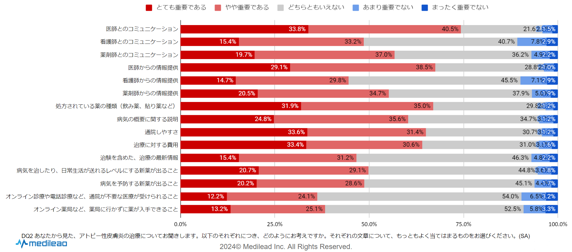 〈図3〉アトピー性皮膚炎の治療で重要性が他と比較して低い項目は「看護師とのコミュニケーション、情報提供」と「オンライン診療、薬局」に関する項目であった。
