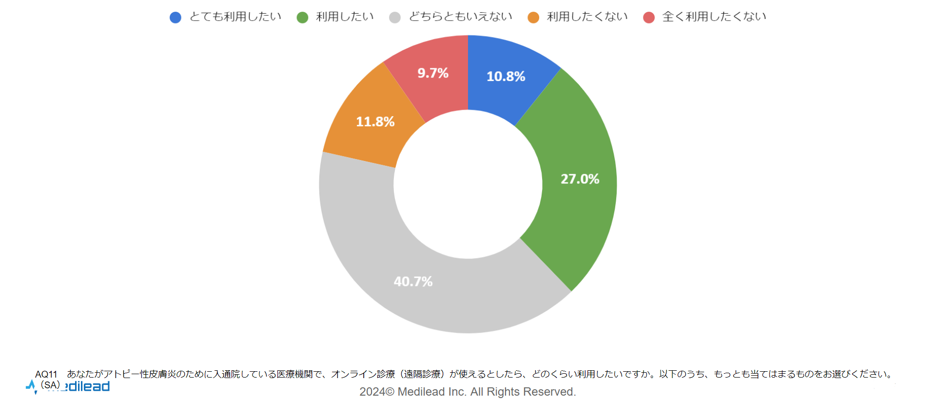 今回のレポートから、アトピー性皮膚炎患者は40代以下に多く、年齢が上がるにつれて症状が落ち着く傾向が見られました。また、1年以内に入院または通院した患者はほとんどの世代で9割以上であり、継続的な経過観察や治療の必要性があり、患者に対しての持続的な医療サポートが重要であることが読み取れます。オンライン診療の利用意向については、保険適用であるにも関わらず約2割が利用したくないと回答しました。この結果から、オンライン診療に対する不安や利便性に対する懸念があることがうかがえます。