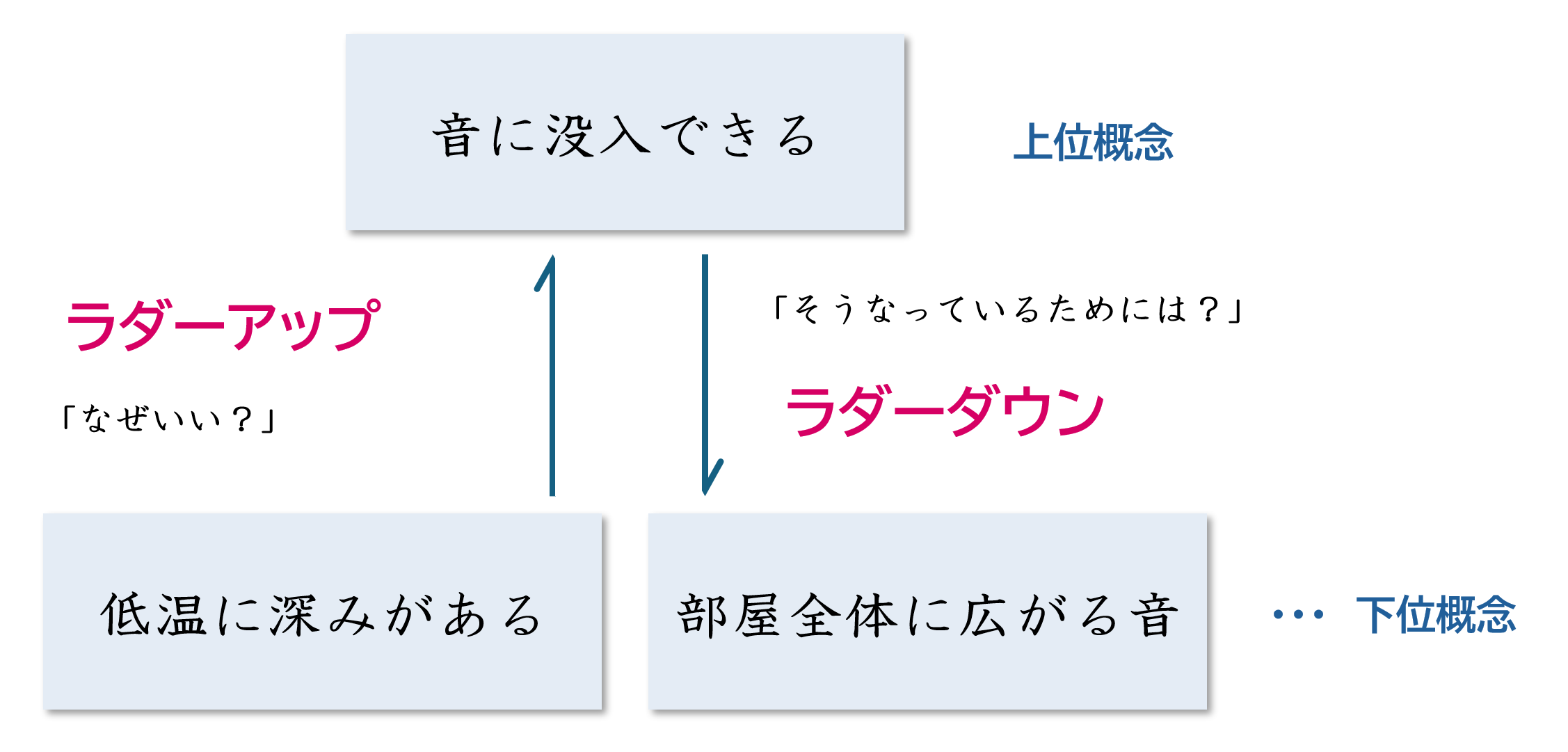 たとえば、「低音に深みがあるからその音楽が好きだ」という答えに対して、「なぜ低温に深みがあると良いのですか?」と聞きます。すると「音に没頭できるから」という答えが返ってきた場合、「音に没頭できることがあなたにとってどんな意味を持つのですか?」とさらに問いかけます。こうして「心が落ち着くから」」「精神的な安らぎを得たいから」という深層の感情や価値観が明らかになっていきます。