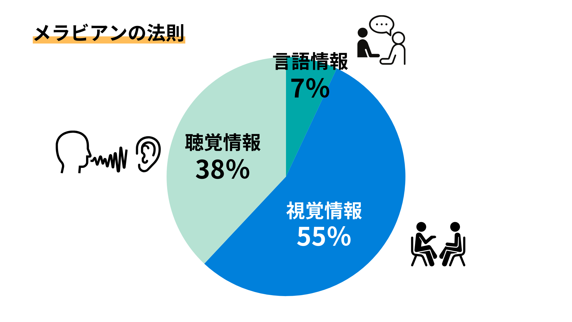 メラビアンの法則によると、言葉から伝わる情報は、全体の7%に過ぎないということです。