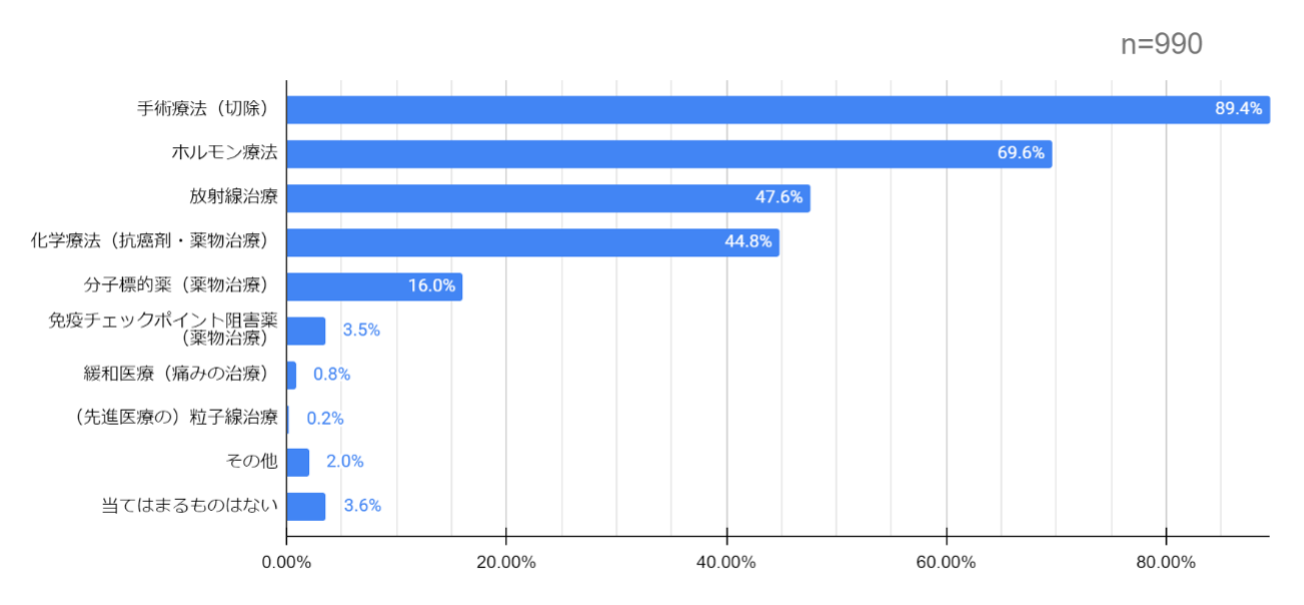 一番多いのが手術療法で、9割近くの患者が経験しています。続いて、ホルモン療法、放射線治療、化学療法と続きました。それぞれについて解説いたします。