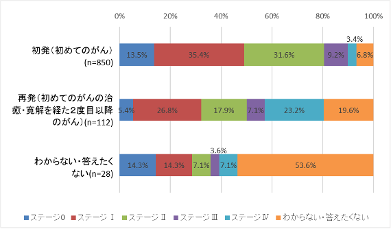 初発の乳がん患者で最も多かったのはステージIで、35.4%でした。再発の場合、ステージIの割合は26.8%と初発時より少し減少していますが、一方で、ステージIVの割合が23.2%と初発時より大きくなっている点が目立ちます。これは、回答者全体におけるステージIVの割合(5.8%)と比較しても非常に高い数字です。このことから、再発時には進行した状態で発見されるケースが多いことが推測されます。ただし、初発時ですでに進行している状態が多いのか、再発時により進行した段階で見つかるケースが多いのかは、このデータだけでは明確には分かりません。