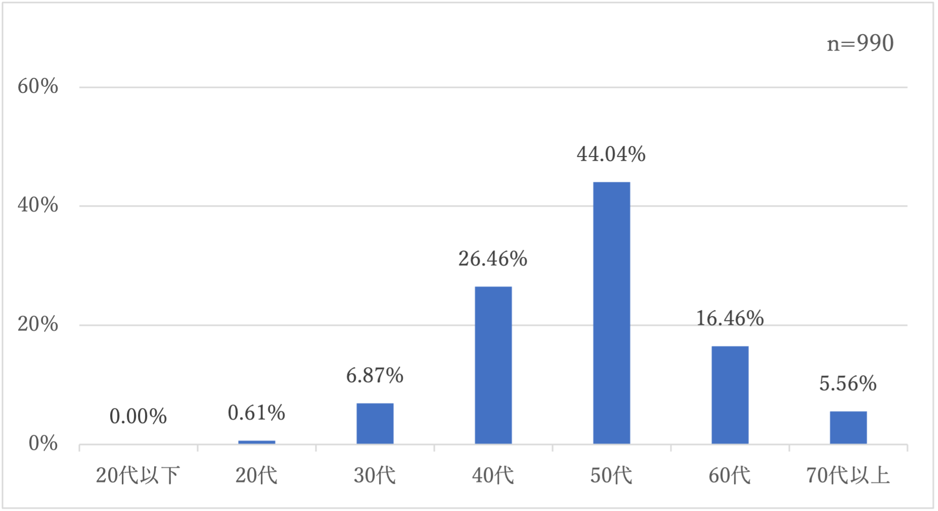 50代が最も多く、全体の44.04%を占めています。続いて40代が26.46%、60代が16.46%と続いており、比較的中高年層に多く見られることが示されています。これは閉経など、ホルモンバランスの変化が関係している可能性もあります。