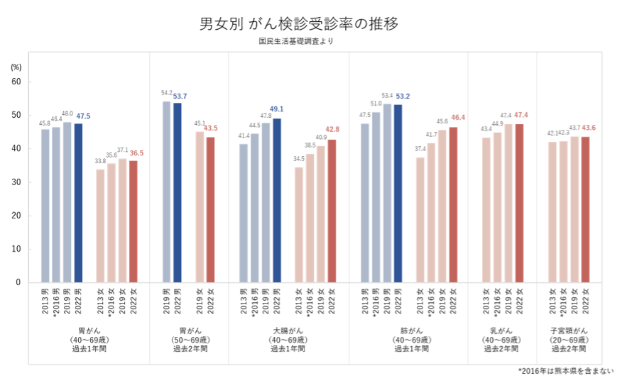 2022年の乳がん検診の受診率は47.4%となっており、年々上昇してはいるものの、未だに半数以上は受診をしていないという現状があります。