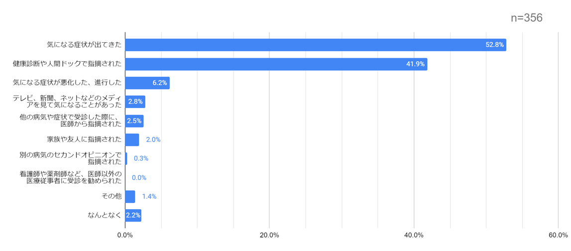 それを自己診断と捉えると、回答者全体の46.6%の人が自己検診をきっかけとして入通院したということになり、定期検診での指摘がきっかけで受診した人の割合(41.9%)よりも高くなっています。