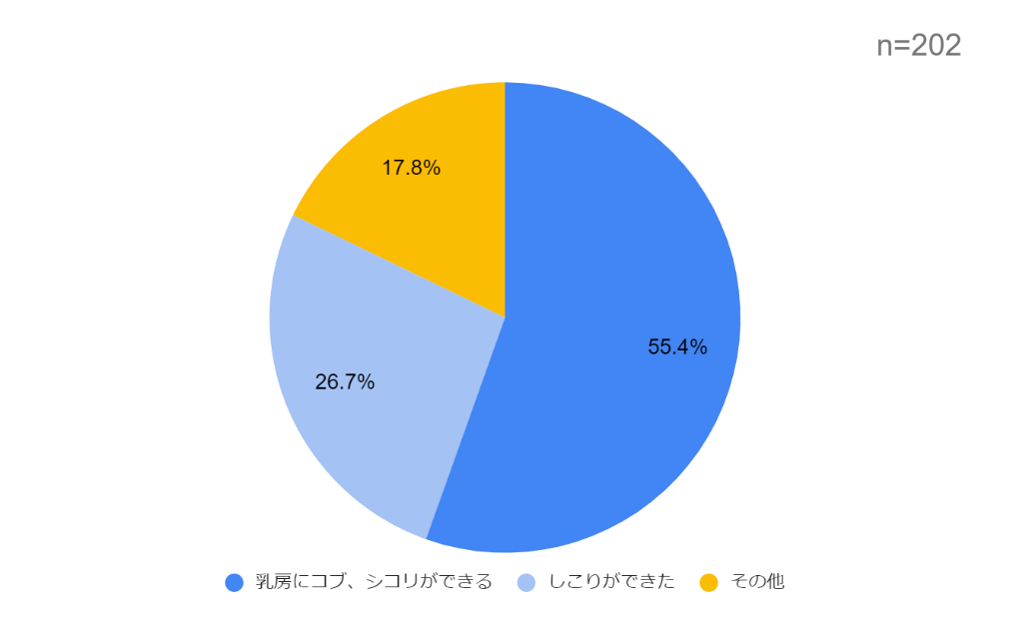 - 乳房や乳頭の皮膚の変化(赤み、腫れ、ひび割れ)