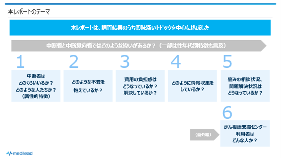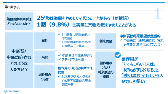 今回は「なぜがん患者さんは薬物治療を中断してしまうのか」について、実際に中断してしまった「中断者」、中断したいとは思ったがやめなかった「中断意向者」、中断したいと思ったことのない「中断意向なし者」の間の違いを、属性や副作用のつらさ、将来展望の観点から見ていきました。