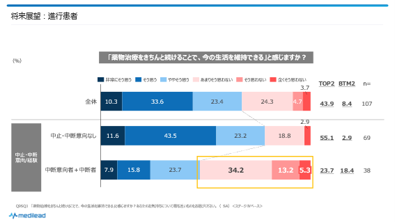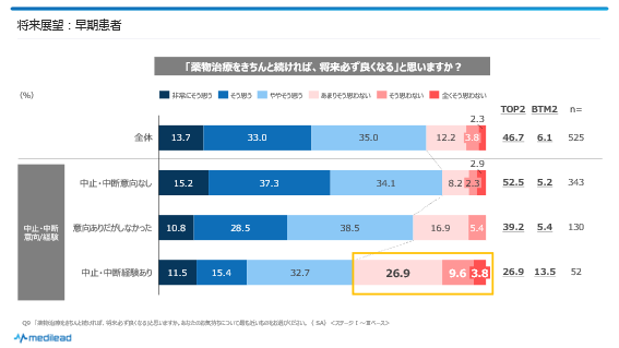また、薬物治療を続けることで「必ず良くなる」「今の状態が維持できる」というポジティブな「将来展望」を持てるかどうかが中断意向に関わっていることも明らかになりました。