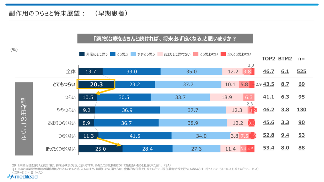 ここから読み取れることは、副作用が「とてもつらい」患者さんは単純につらさに負けてしまうとは限らないということです。副作用がつらくても「必ず良くなる」という希望を強く持ち、頑張ろうとしているということなのではないでしょうか。患者さんなりの強さを持って治療を続けようとしている状況があると考えられます。