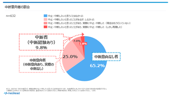 いずれにしても、若年層の患者さんほど「やめたい」と思う傾向があることがうかがえます。ただし、中断意向は年齢を重ねるにつれて低下するのかのか、それとも「世代特有の傾向」として現れているのか(現在40代以下の世代が50代、60代となっても同様の価値基準を持ち続け、中断意向は低下しないのかのか)は、今回の調査では明らかになっていません。