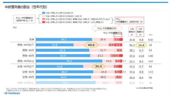 一方で、男性の70代以上では「中止・中断したいと思うことはなかった」が76.9%と、他の年代に比べて顕著に高い結果となりました。