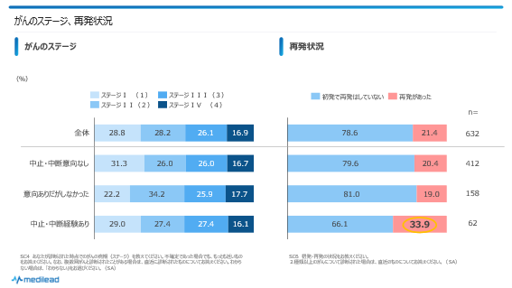 一方、再発状況では、中断者において「再発があった」患者さんの割合は33.9%と、全体(21.4%)より高めでした。これにより、再発患者の方が薬物治療を中断してしまう傾向にあることがわかります。薬物が体に合わないケースがあるだけではなく、ステージに関係なく再発による様々な不調や不安などが、薬物治療継続のモチベーションを低下させてしまう状況があることが推測されます。