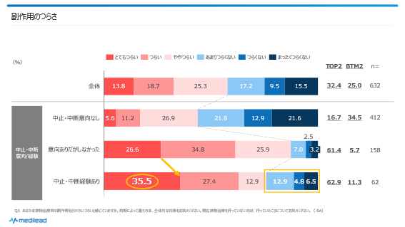 「中断者」の35.5%が、副作用が「とてもつらい」と回答しており、「中断意向者」の26.6%と比べるとかなり高く、治療中断には副作用のつらさが関係している可能性が示唆されます。