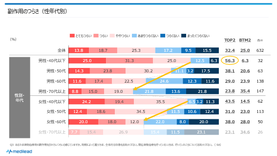 副作用のつらさについて、特に男性では年代が若いほど「とてもつらい」~「ややつらい」の割合が高く、年代が上がるにつれて「あまりつらくない」~「まったくつらくない」と感じる割合が増える傾向が見られました。