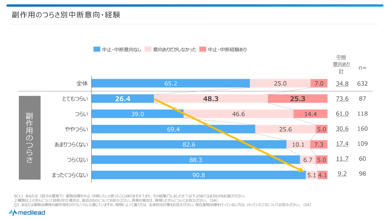 副作用がつらい患者さんほど「中断意向なし」の割合が低く、「中断意向あり」や「中断者」の割合が高いことがわかります。