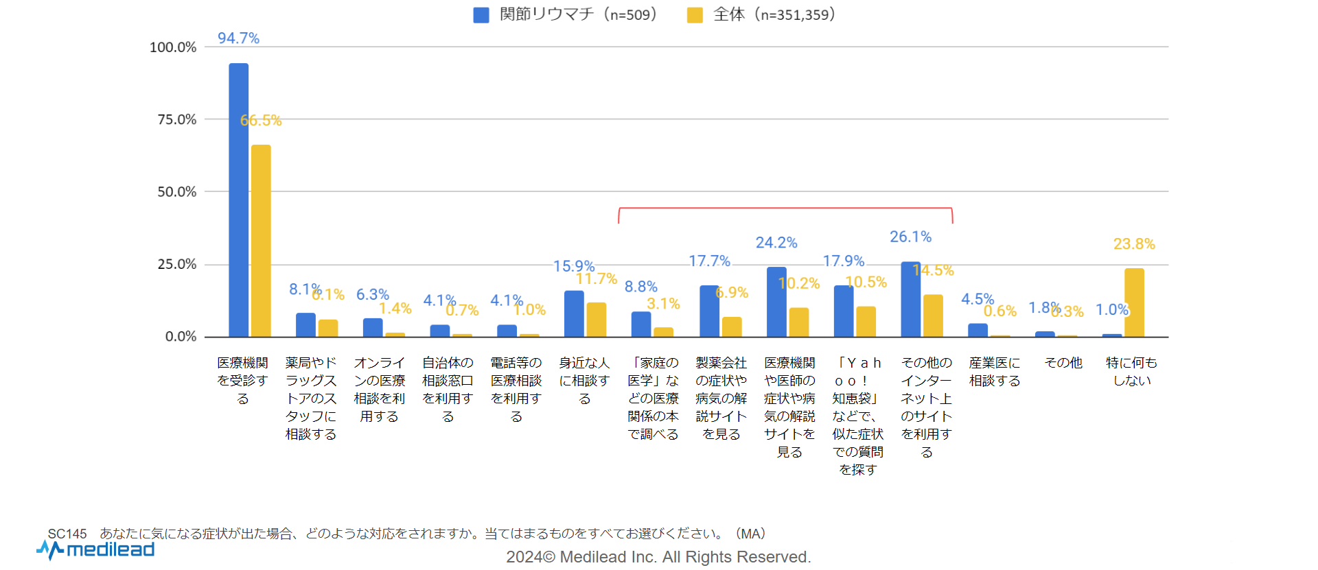 関節リウマチ患者のうち、気になる症状が現れた際に医療機関を受診する割合は9割を超えている。また、情報収集を行う割合も全体と比較して高く、自身の症状を理解しようとする意識が強いことが伺える。〈図3〉