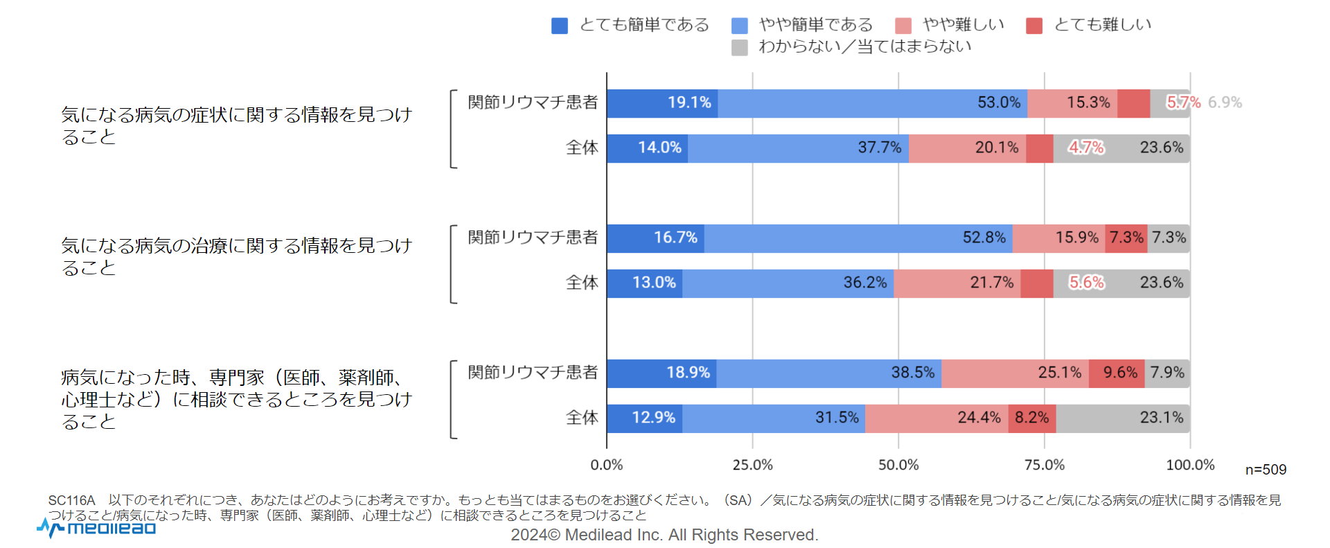 気になる症状や病気、治療に関する情報を収集することが『とても簡単』または『やや簡単』と回答した割合は約7割にのぼり、全体平均の約5割を大きく上回る結果となった。また、相談先を見つけることについても、簡単だと感じている割合が全体を上回っていた。〈図4〉