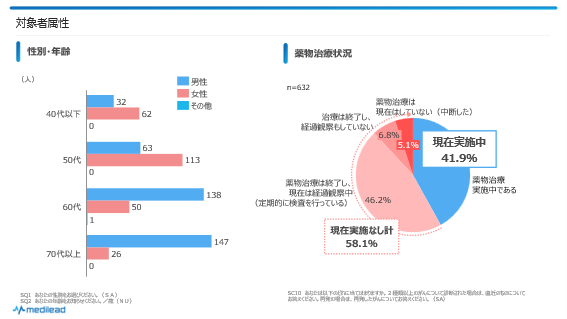 株式会社クロス・マーケティンググループ(本社:東京都新宿区、代表取締役社長兼CEO:五十嵐 幹、東証プライム3675)のグループ会社である株式会社メディリード(本社:東京都新宿区、代表取締役社長:亀井 晋、以下「当社」)は、がん患者さんの薬物治療継続についての現状、およびその背景となる意識や行動についての自主調査(2024年)を行い、632名からの回答を得ました。
