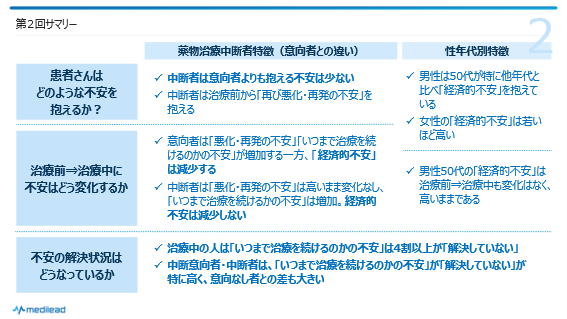 また、中断意向者は「経済的不安」が治療前から治療中にかけて減少していましたが、中断者においては変化がありませんでした。治療法には様々選択肢があり、かかる費用も広範囲ですが、中断者は経済的不安について取れる手段を十分に講じていない可能性もあります。結果として経済不安が解決せず、薬物治療継続のモチベーションも保てなくなっているのかもしれません。