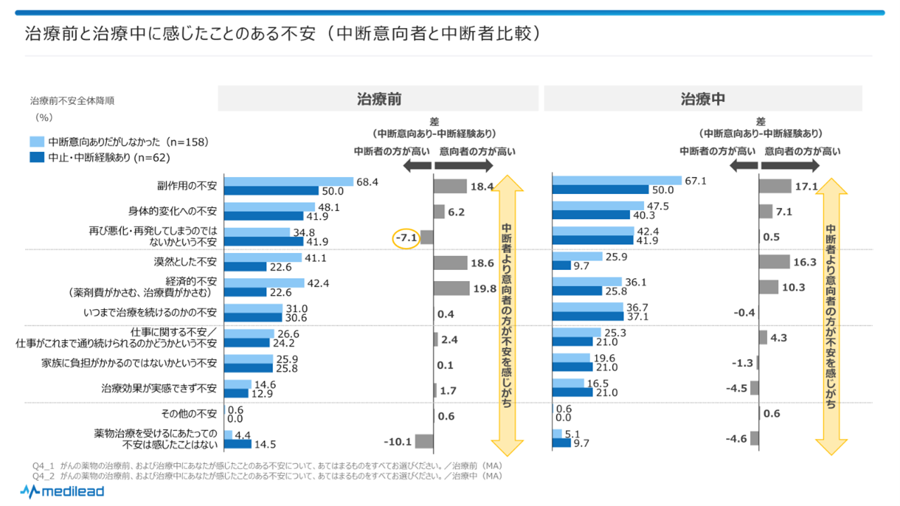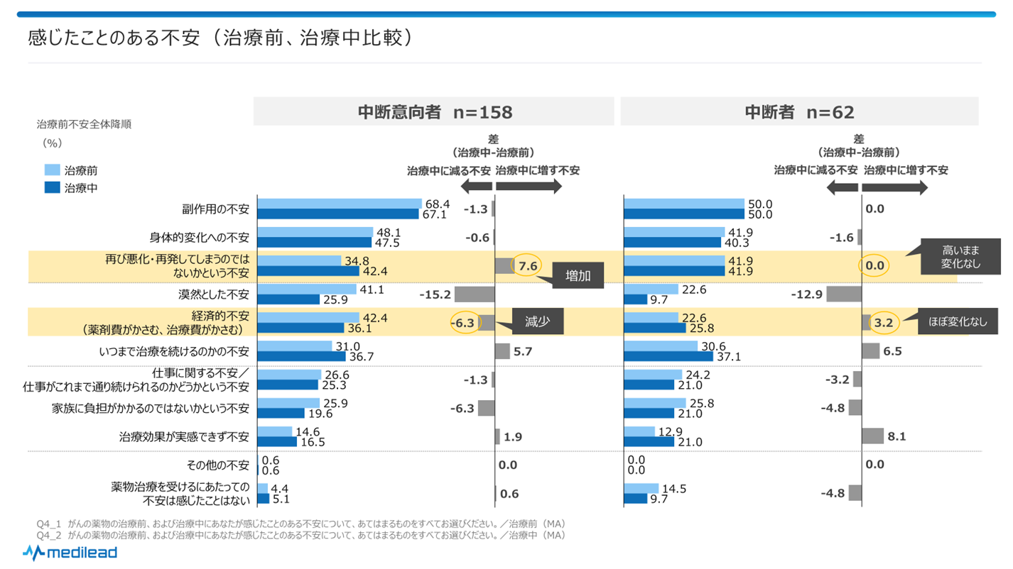 中断意向者と中断者でグレーの横棒チャート(治療前と治療中変化)の傾向が異なるのは「経済的不安」です。中断意向者の「経済的不安」は治療前⇒治療中で6.3%減少しているのに対し、中断者は治療前⇒治療中でほぼ変化のない3.2%増でした。つまり、中断者において、経済的不安は治療が進行してからも減少はしていないということです。中断者においては、経済的不安の数値自体は意向者より低めではあるものの、治療前から治療中にかけて経済的不安があっても、これといった対策はとられておらず、結果不安が減少しないという状態になっている可能性があります。