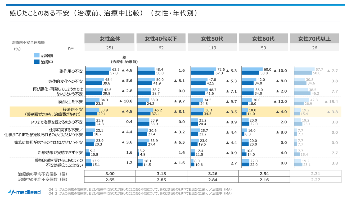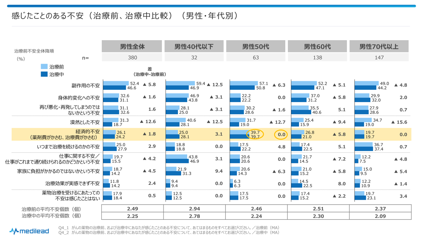 経済的不安に着目してみると、経済的不安が最も高いのは男性では50代で、全体の治療前、治療中と比較して15%程度高く、また、治療前から治療中の変化がなく、39.7%と高いままです。