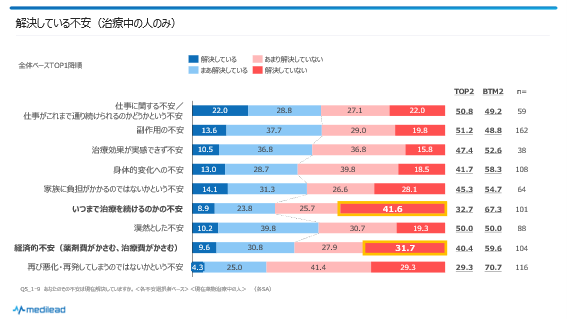 「解決していない」を示す赤色が目立つのは「いつまで治療を続けるのかの不安」という項目で、41.6%にのぼりました。