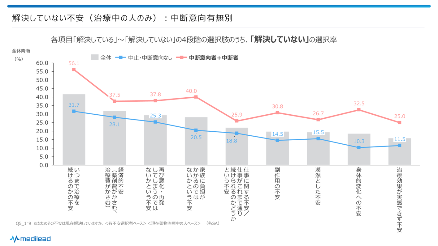 「いつまで治療を続けるのか」に対する不安は解決していない割合が高いことがわかりました。治療の先行きが見えないことからくる不安が治療継続モチベーションの低下につながっていることがうかがえます。このような場合、医師による治療計画や目標の情報提供不足も、患者さんの不安増大につながる可能性があります。