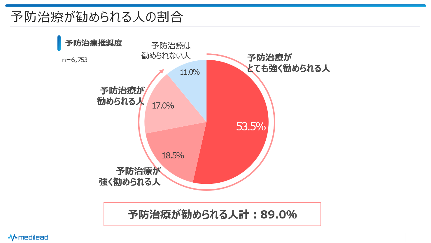「予防治療がとても強く勧められる」とされた人は半数を超え、「強く勧められる」「勧められる」とされた人も含めると、約9割が「予防治療の対象に該当するという結果になりました。