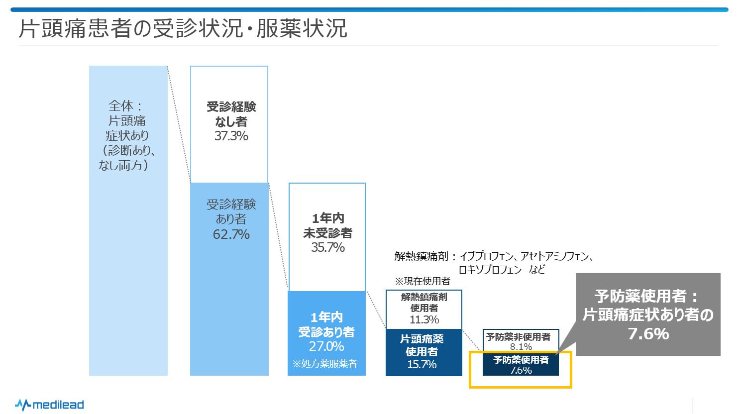片頭痛の症状がある人のうち、約6割が医療機関での受診経験がありました。一方で、予防薬を使用している人は7.6%にとどまりました。