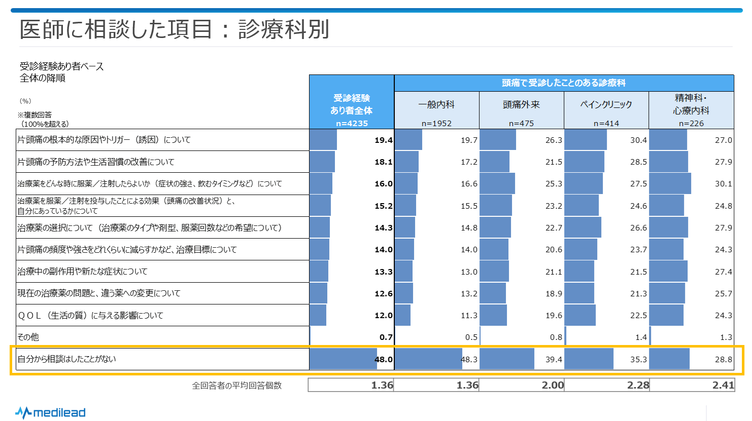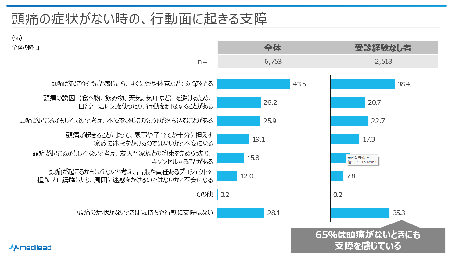 受診経験がない人でも「支障はない」と回答した人は35.3%にとどまり、およそ65%は頭痛がない時でも気分の落ち込みや行動の制限など、なんらかの支障を感じていることがわかりました。