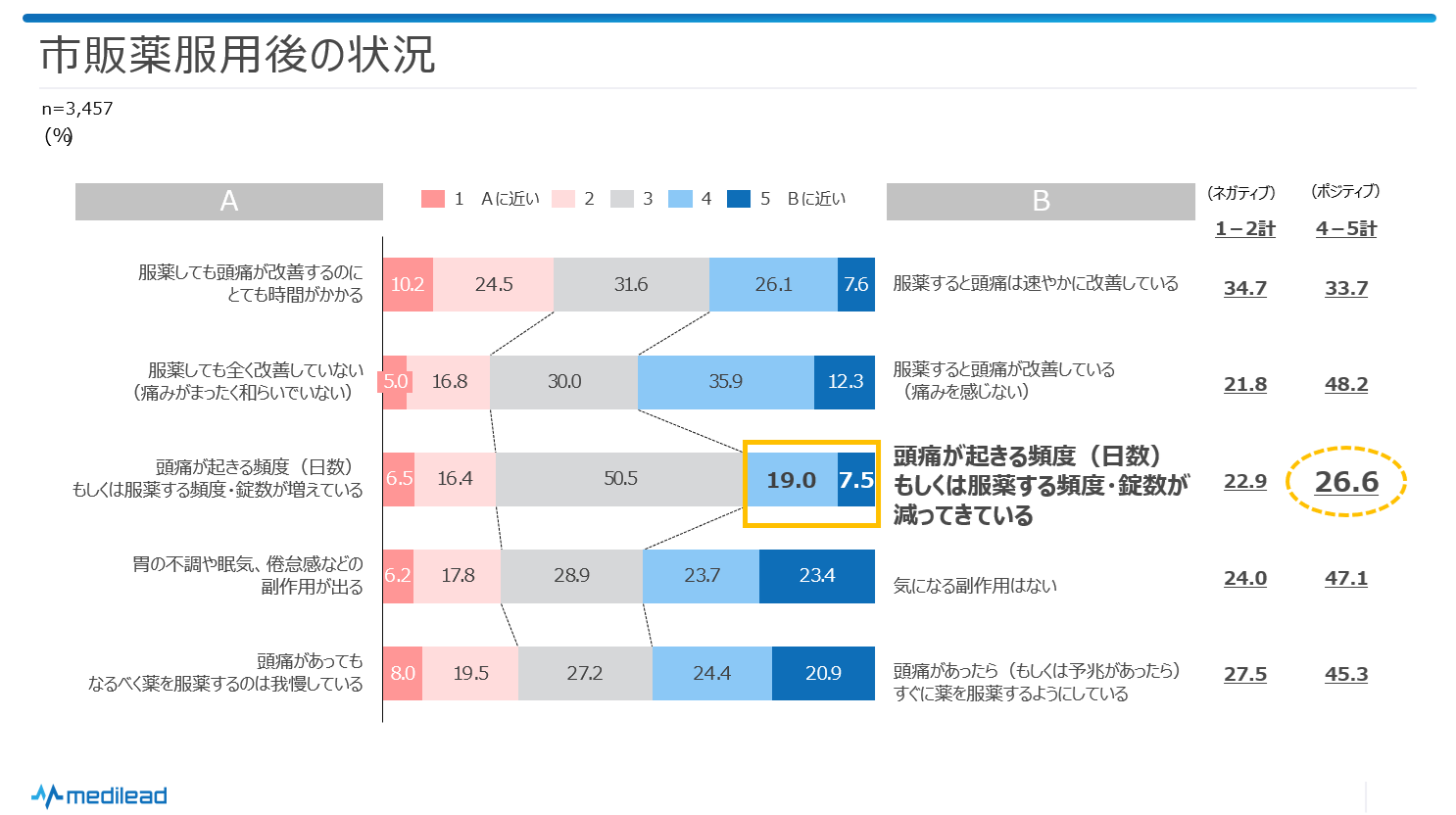 過去1年以内に受診しておらず、市販薬を使用している人に対し、「服用後の変化」についてA(ネガティブ)に近い方を1、B(ポジティブ)に近い方を5として5段階で評価してもらった結果です。「頭痛が起きる頻度(日数)もしくは服薬する頻度・錠数が減ってきている」というポジティブな回答は26.6%にとどまりました。